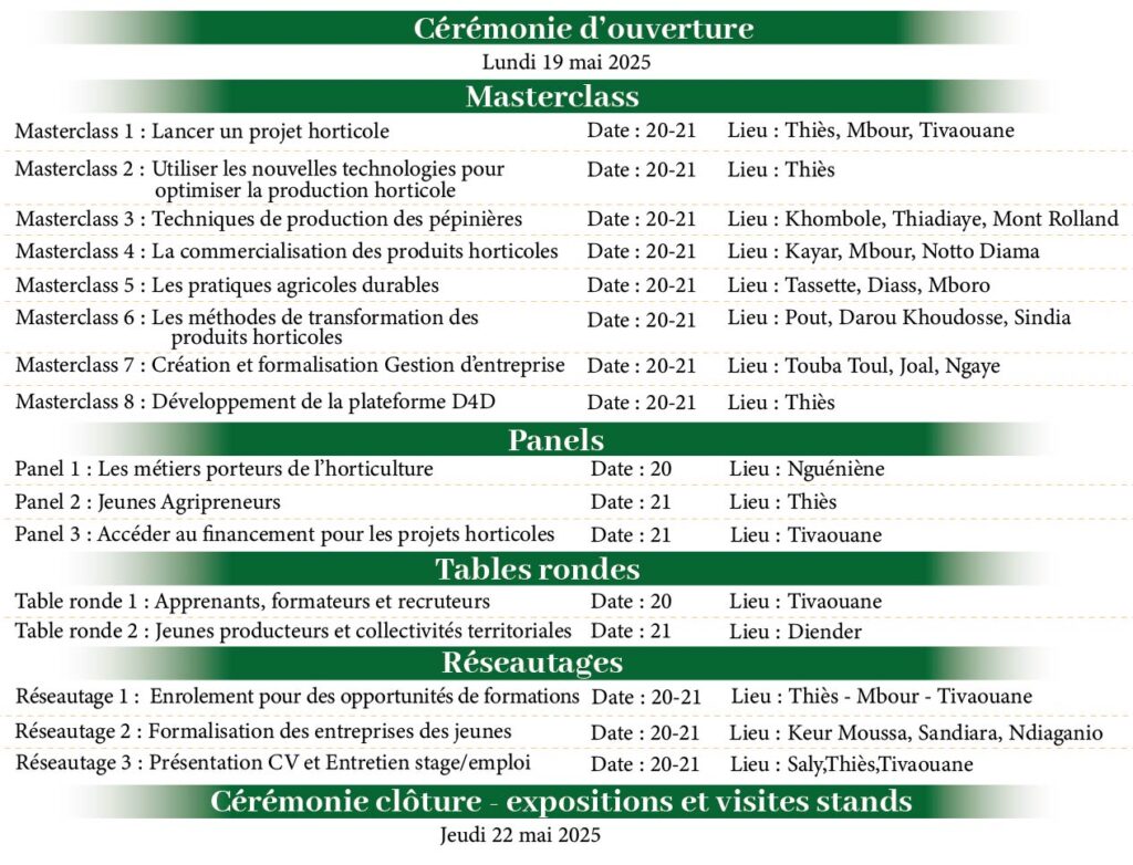 Pendant quatre jours, le Youth Power Event proposera une programmation riche et dynamique : des masterclass pour découvrir comment lancer son projet horticole, utiliser les nouvelles technologies agricoles, maîtriser le marketing digital ou encore transformer les produits locaux pour créer de la valeur ajoutée.